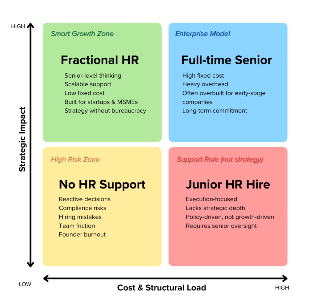The sweet spot for startups, MSMEs, and organizations in transition? Top-left: senior HR thinking with minimal overhead. That’s fractional HR. You get strategic perspective exactly where it matters most, with the flexibility to scale involvement up or down based on what you’re navigating.